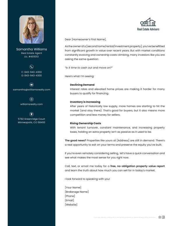 Encourage hesitant homeowners to take action with this timely, data-driven letter highlighting strong market conditions and real estate opportunities.