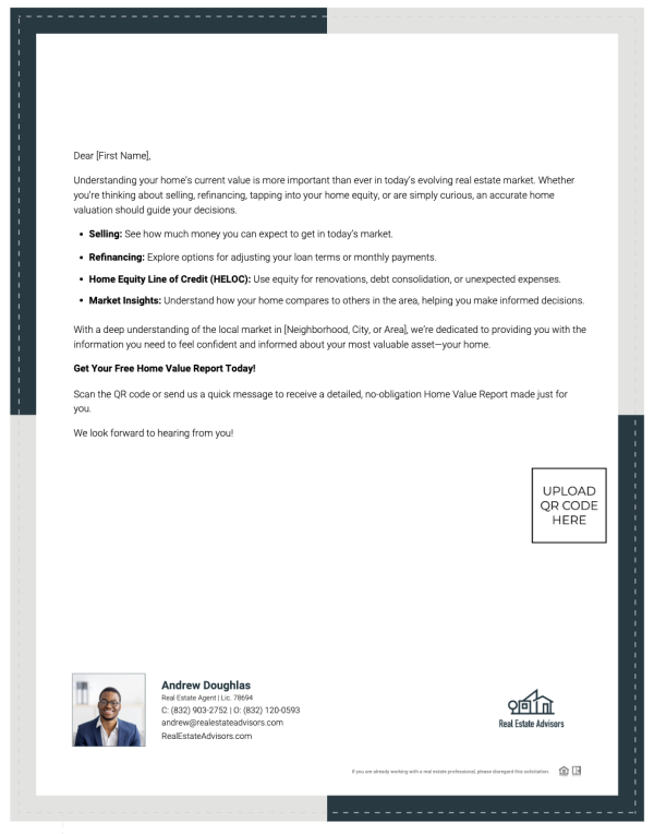 Stay top of mind with a personalized letter that offers clients valuable insights into their home’s value and neighborhood market trends.