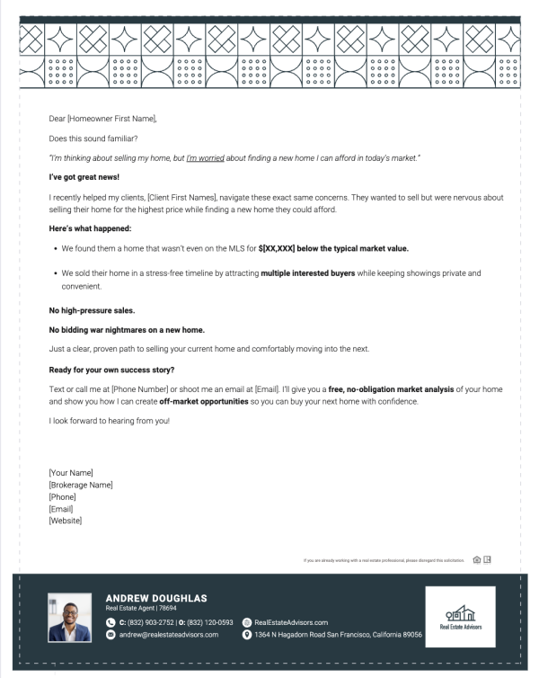 Stay ahead of the curve with our prospecting marketing letter template. Deliver market updates that matter, positioning you as the real estate expert your prospects turn to for insights.