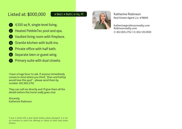 The 7 Reasons to Love [Address] postcard is designed to attract attention and generate buyer excitement by showcasing a property’s best features in a concise, compelling format. Agents can customize this postcard to spotlight what makes the home special—like its open floor plan, modern kitchen, or location perks—while reinforcing their brand with automatically applied contact information and design elements. Ideal for just-listed promotions or neighborhood mailers, this postcard helps turn local awareness into real leads.